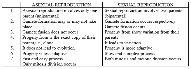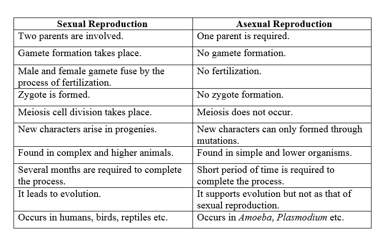 In asexual reproduction one parent is involved and in sexual reproduction two parents are involved. Offspring produced in the asexual reproduction are genetically identical to the one parent. Asexual reproduction requires only a single divisible cell to produce a new organism whereas sexual reproduction requires two gametes their formation and fusion.